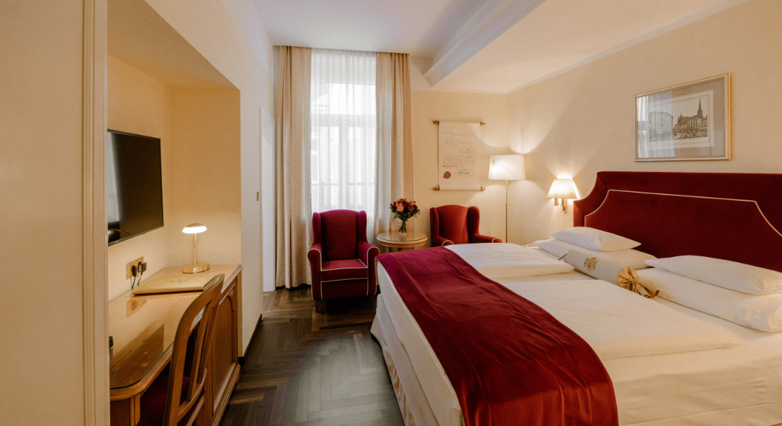 Your wedding guests will discover a serene retreat within our 79 classically furnished and cozy rooms . Each space is designed as a peaceful haven after a day of exploring Vienna’s romantic streets or celebrating your union. Our quaint and characterful rooms are strictly non-smoking and feature modern comforts such as air-conditioning, new beds with premium comfort mattresses, flat-screen TVs with Sky channels, mini-bars, and tea/coffee facilities, ensuring every need is met with thoughtful care . The exquisite room paneling and wallpaper, sourced from a former K&K court supplier of picture frames, add a touch of imperial grandeur to each stay.